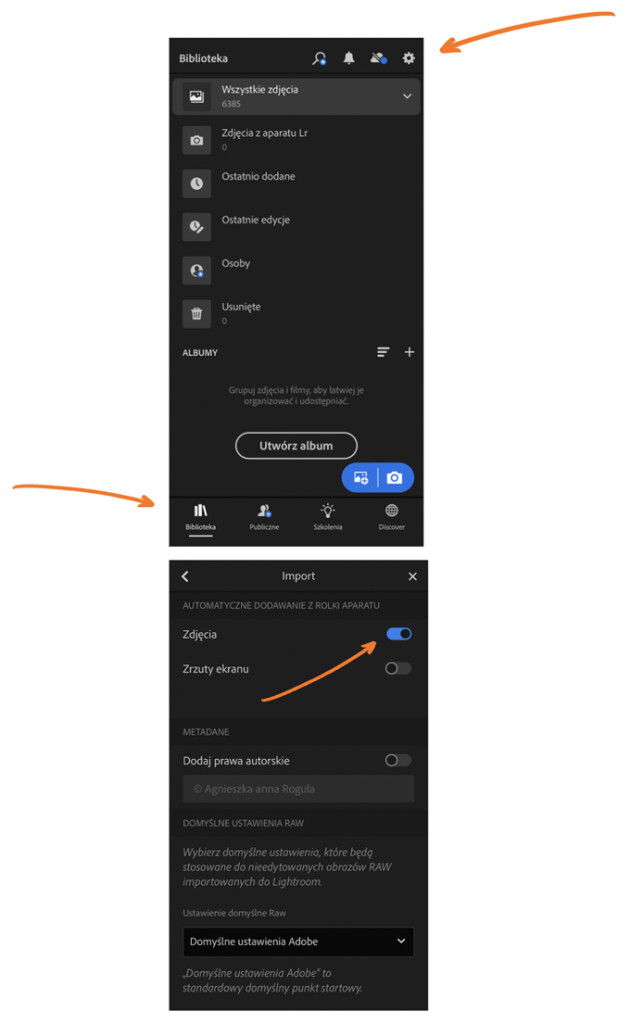 Aby korzystać z tego sposobu wyświetlania zdjęć kliknij w Bibliotece zdjęć ikonę ustawienia w prawym górnym rogu. Następnie w zakładce Import włącz Zdjęcia w opcji Automatyczne dodawanie z rolki aparatu