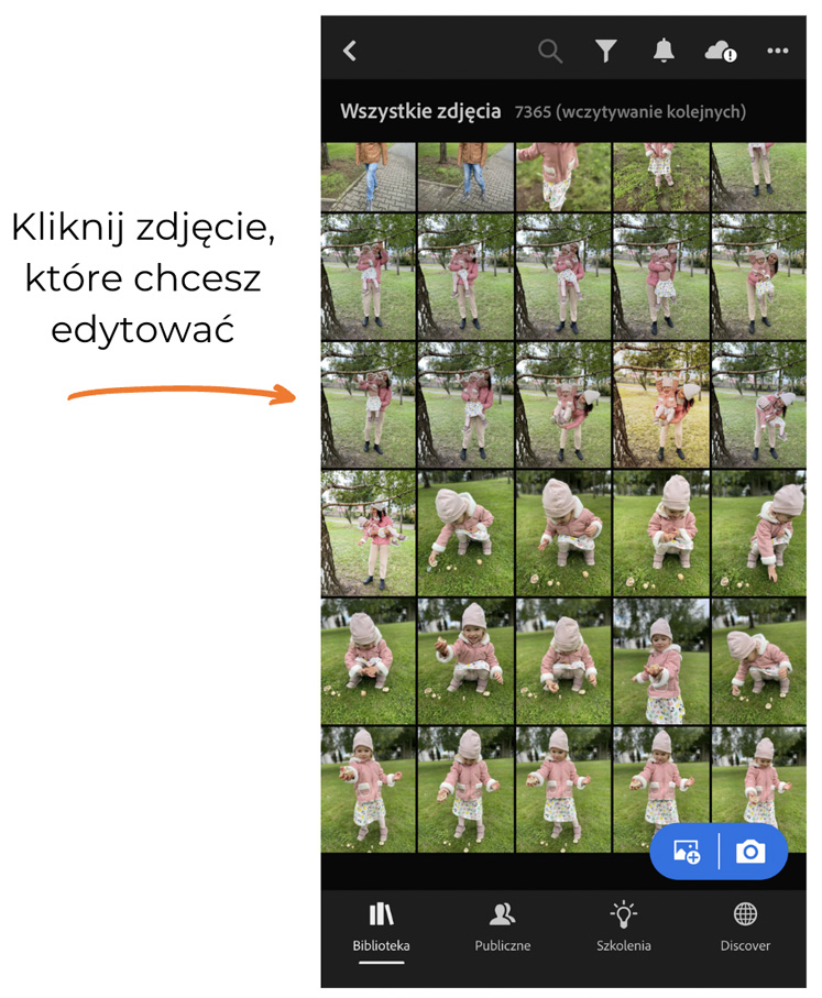 Jeśli wybrałaś pierwszy sposób wyświetlania zdjęć, za każdym razem musisz importować zdjęcie z rolki aparatu, a następnie trzeba w nie kliknąć, żeby przejść do jego edycji. Jeśli wybrałaś drugi sposób wyświetlania zdjęć, w zakładce Wszystkie zdjęcia zobaczysz zdjęcia z rolki aparatu. Wystarczy, że klikniesz w wybrane zdjęcie i przejdziesz wtedy do jego edycji.
